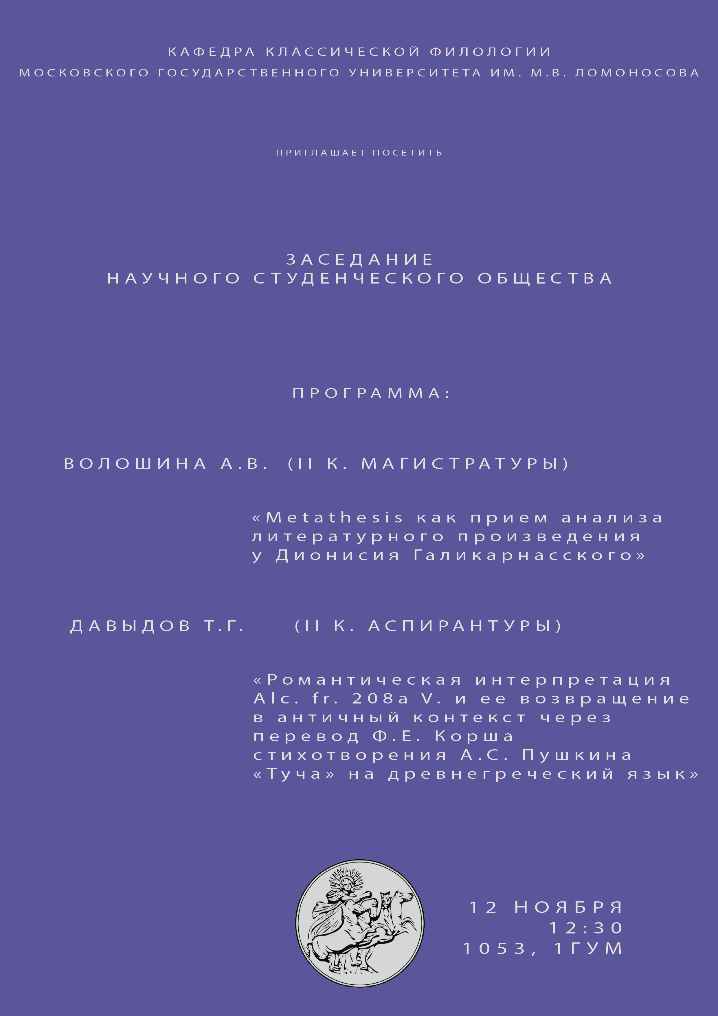 Дорогие коллеги, мы c радостью сообщаем о том, что на кафедре классической филологии возобновляются заседания Научного студенческого общества.
